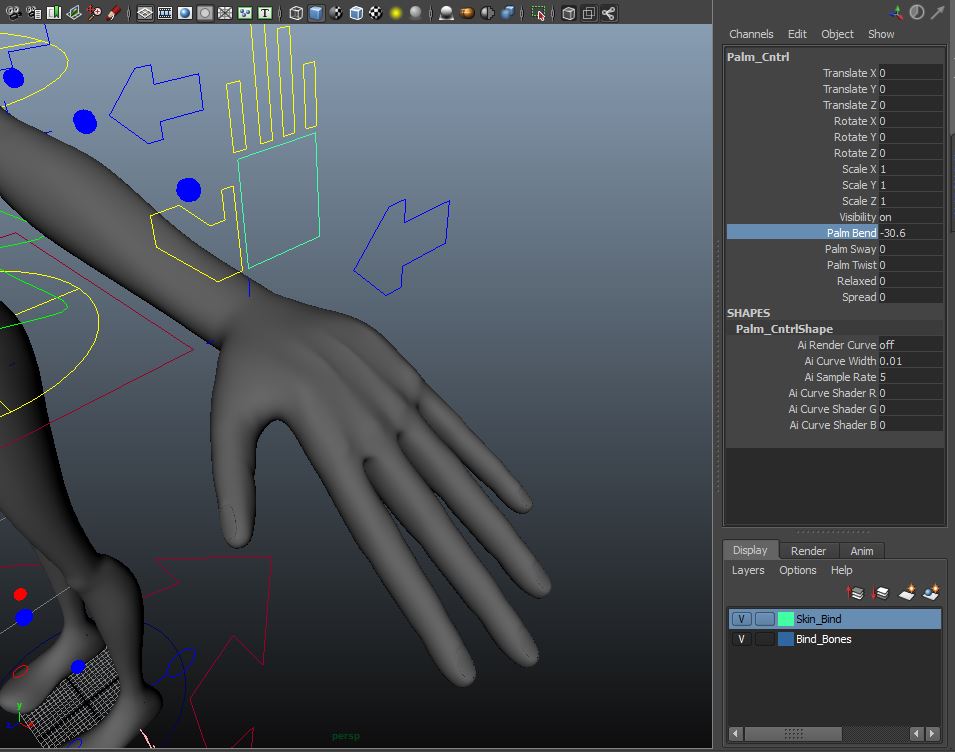 Finally I worked on hands. It took me some time to find a good setup for the hands. I was able to set up the hands in a way that will let me go in and add in extra control in the future. As well I avoided using sdks and used the connection editor, which will also save time in the future. The rest of the hands will be finished tomorrow.