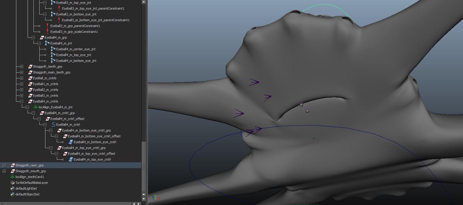 I finished rigging the shoggoth. I added in clusters with fk and ik controls to all of the small tentacles. I added in SDKs in for all of the mouths and eyes. I added in some additional controls to morph the body. The only hard part of the week was trying to get the weighting to work with the tentacles and the body moving.