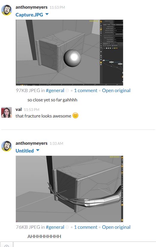 Animation polishing is coming along, and we’re well on our way to finishing the animation. It’s going to be tough and we’ll be working up until the very end, but we’re still confident and optimistic. The biggest hurdle in our path this week has proven to be the render farm, which is still acting erratically. Oftentimes on the same farm machine, render times will fluctuate between 8 hours and 18 minutes on almost identical frames. It should go without saying that we need the farm to be stable in order to finish our project on time. Both our team and Jura have been in near constant communication with Jay about it, and this week we plan on meeting in person to talk about the farm.